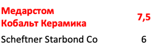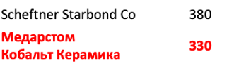 "Кобальт Керамика" - довольно особенный сплав и имеет незначительное количество конкурентов для сравнения, поскольку только Медарстом и Scheftner имеют в линейке кобальтовые сплавы под керамику без содержания вольфрама.